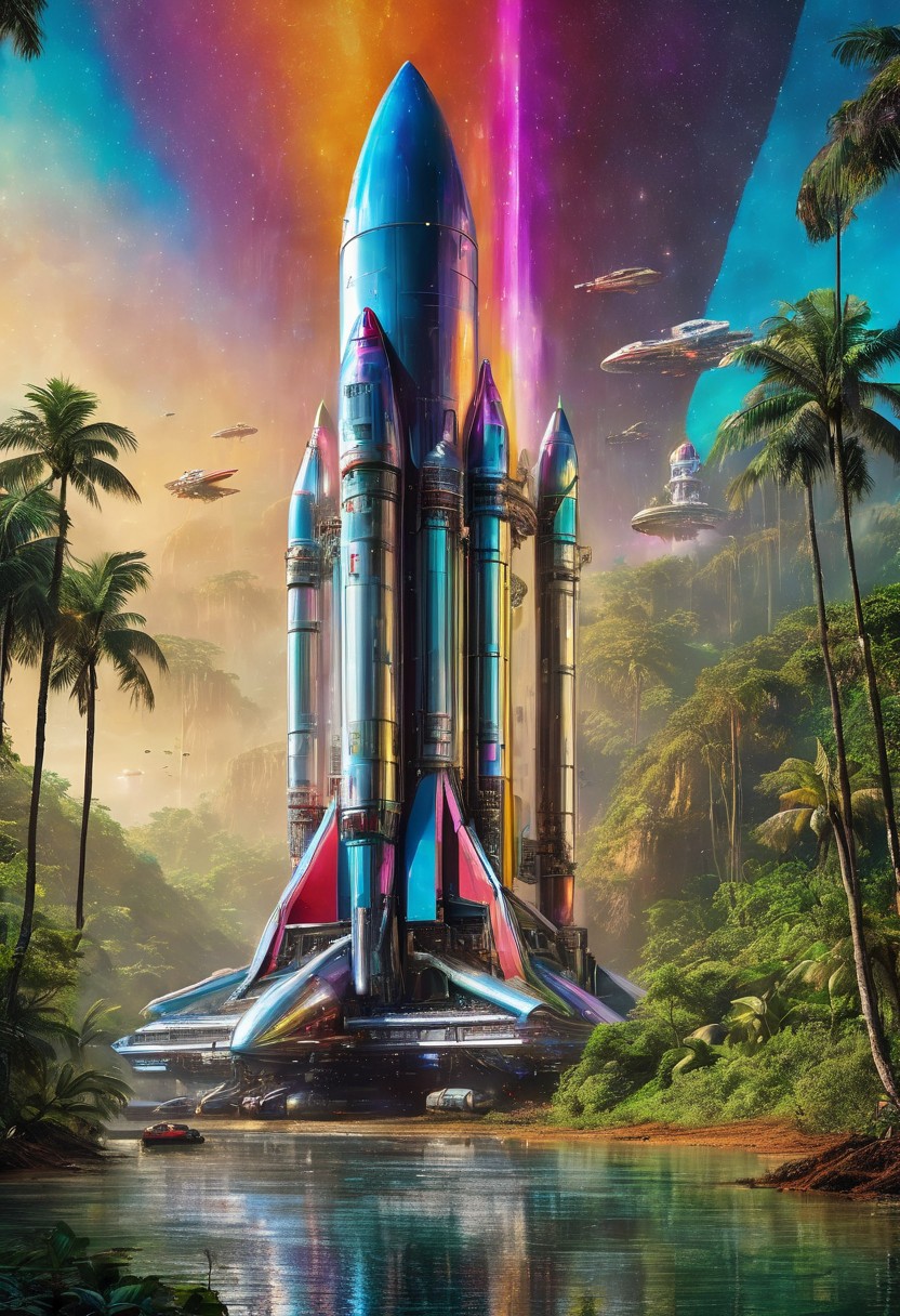rainb0w m0rph, A large streamlined ((rainbow metalic spaceship)) with containers and large rocket boosters, detailed pipe work, and windows, styled in top secret by nasa, ready on a launch site on a jungle planet, vibrant colors, high detail, photograph, cinematic lighting, sharp focus, by David LaChapelle and Annie Leibovitz, 8k resolution, trending on Instagram. <lora:Flux_Rainbow_Morph:1> <lora:03ad2c7f-95b7-4865-a182-5d836919cabe.TA_trained:1> Solar Relics