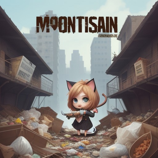 (crowd), chibi, cute, monster, food, machine, mouse, cat, war,, bullets, waste, trash, (village background), building, journal cover, text, big text, retggrgrtg
