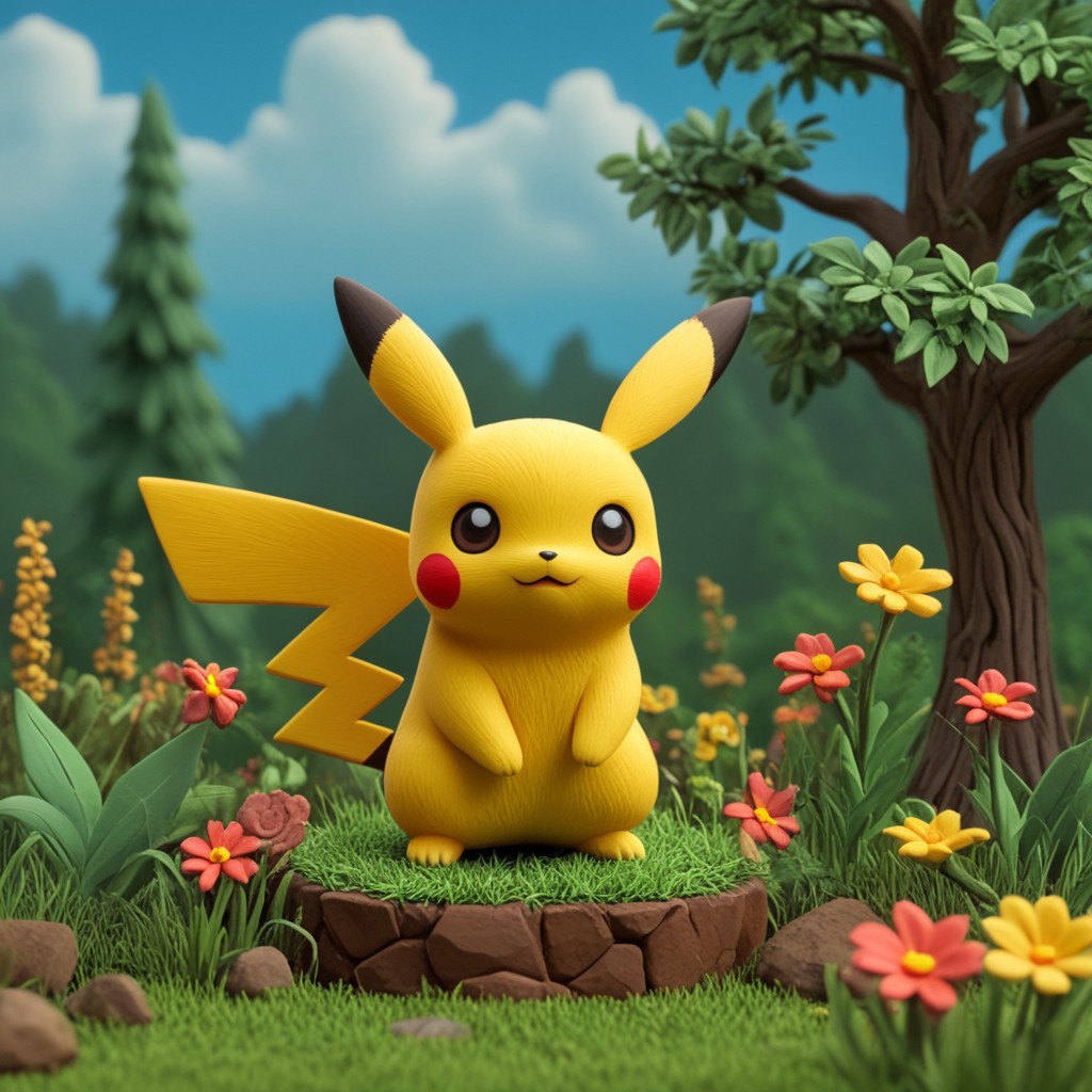 novuschroma51 style, Pikachu standing in a lush green field, surrounded by vibrant trees and colorful flowers, as bright electric sparks crackle from his rosy cheeks. The entire scene is crafted in a charming claymation style, with Pikachu’s soft, rounded clay texture giving him a handcrafted, stop-motion feel. The grass, trees, and flowers are sculpted from vividly colored clay, with visible fingerprints and smooth, slightly uneven textures, enhancing the handmade aesthetic. The electricity crackling from Pikachu's cheeks glows intensely, casting a warm yellow light onto the surroundings. The atmosphere is joyful and lively, with a bright blue sky and fluffy clay clouds. The scene has a whimsical, storybook-like charm, reminiscent of classic stop-motion animation. (masterpiece: 2), best quality, ultra highres, original, extremely detailed, perfect lighting)