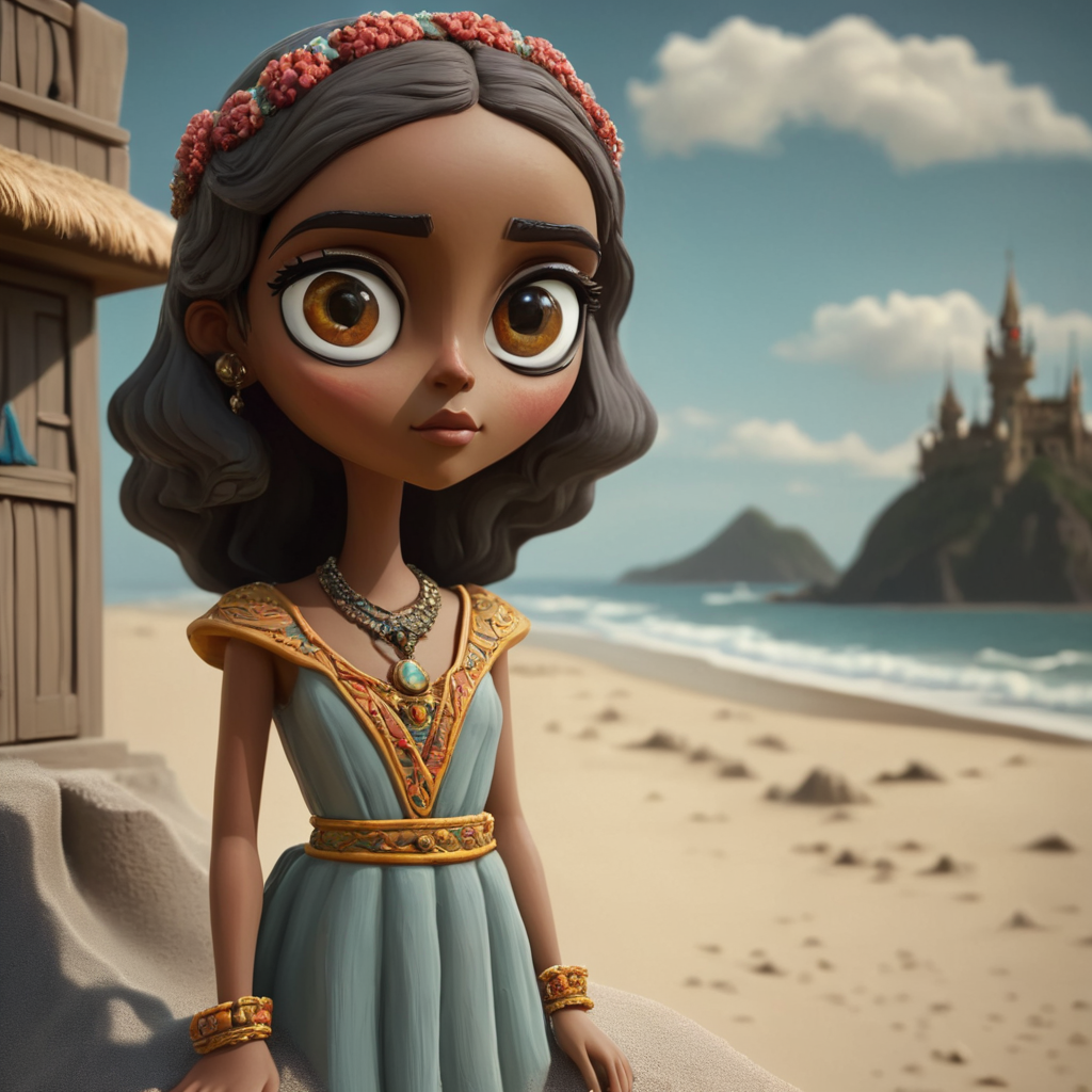 beach, beautiful girl made of clay standing on sand castle balcony, detailed beautiful face, large detailed multi color eyes, novuschroma51 style <lora:novuschroma51 style_claymation:1.05> <lora:Alien Style:0.75>