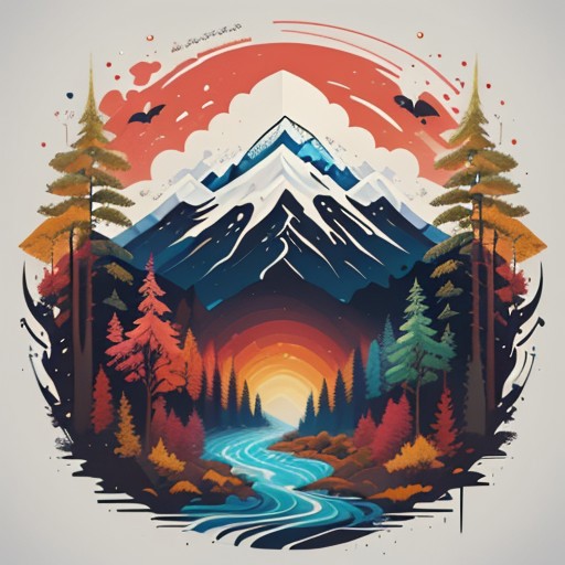 masterpiece, CLIPART design, painting of a mountain with trees and water, a detailed painting by Petros Afshar, shutterstock contest winner, environmental art, detailed painting, outlined art, 2d game art, printed as a t-shirt, simple background, tshirt design