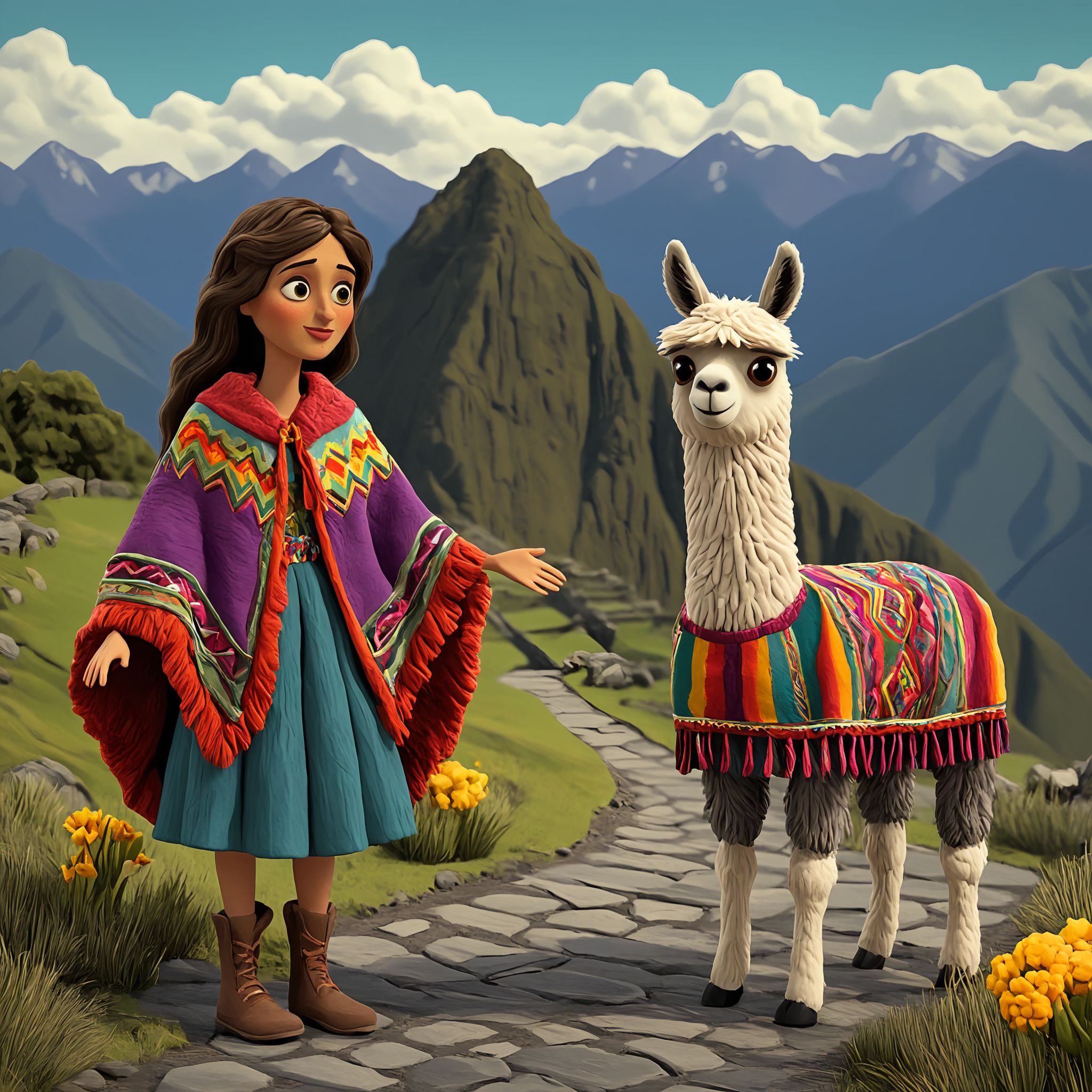 <lora:novuschroma51 style_c:1.3>, novuschroma51 style, claymation, BREAK, girl and a llama , together, girl1, wearing a montera, poncho, ojatas, lliklla, colorful blouse, embroidered jacket, llama, white fur, colorful blanket, daytime, clouds, mountains, gray, rocky, winding path, vivid colors, high-res, beautiful aesthetic, very intricate, high-quality details, vibrant, highly detailed,