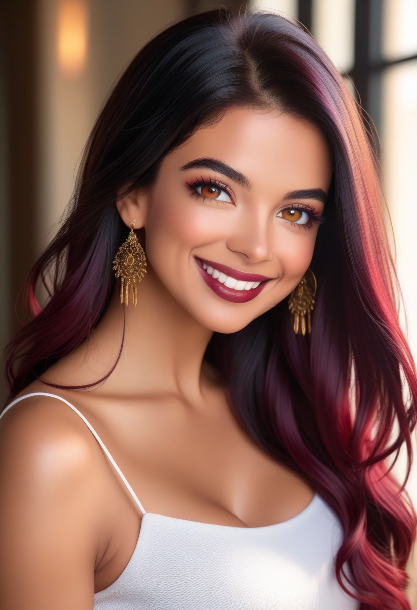 A gorgeous woman with long dark hair smiles warmly at the camera, her hazel eyes sparkling under soft, cinematic studio lighting. Her tan skin glows with perfect, detailed features enhanced by bold eyebrows, long eyelashes, dark eyeshadow, and dark red lipstick. She exudes the beauty of an Italian or Spanish heritage, her natural charm captured in a realistic, Instagram-worthy photo. The scene emphasizes her cleavage and confident grin, drawing focus to her radiant face within the intimate, indoor setting. rolldi, long straight hair