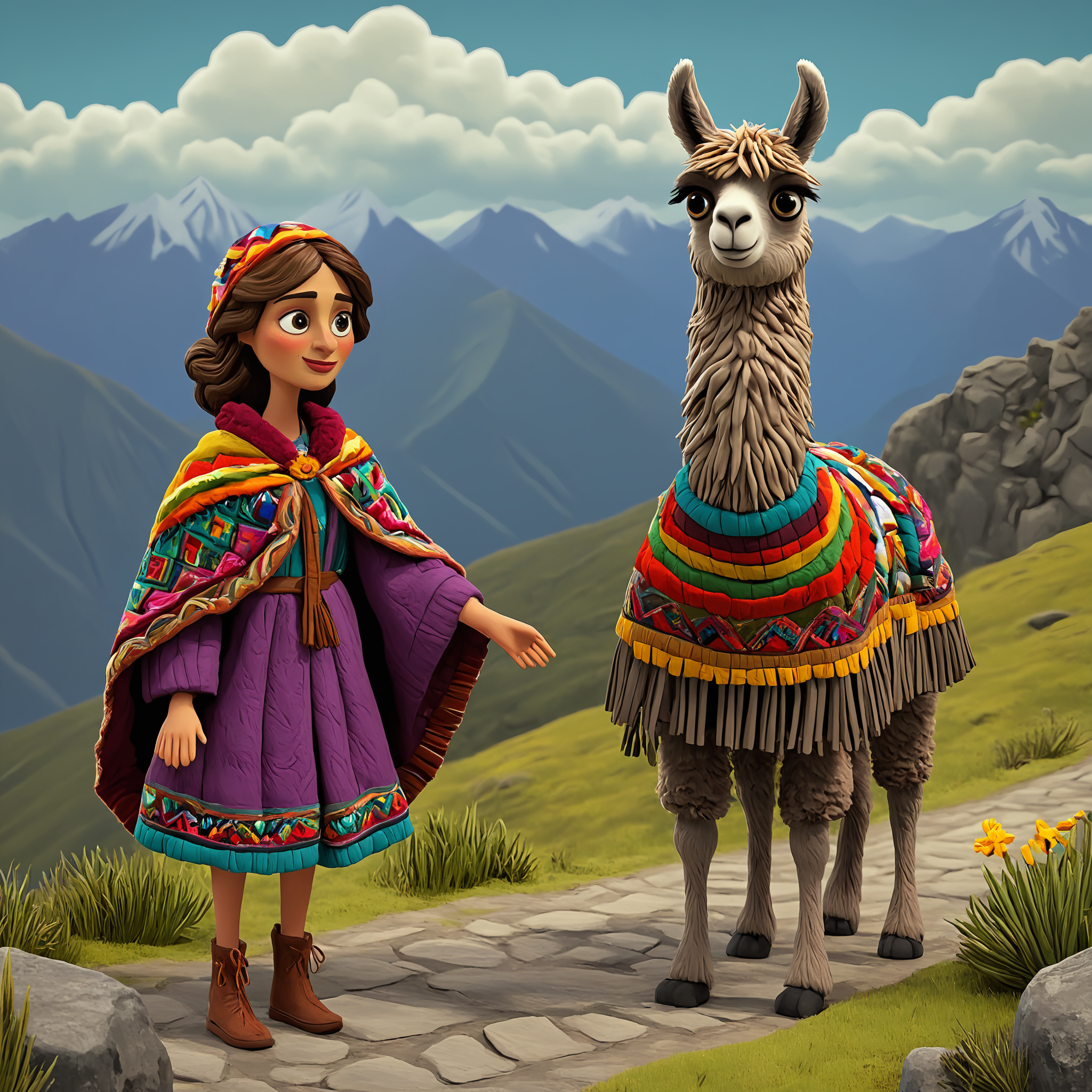 <lora:novuschroma51 style_c:1.3>, novuschroma51 style, claymation, BREAK, girl and a llama , together, girl1, wearing a montera, poncho, ojatas, lliklla, colorful blouse, embroidered jacket, llama, brown fur, colorful blanket, daytime, clouds, mountains, gray, rocky, winding path, vivid colors, high-res, beautiful aesthetic, very intricate, high-quality details, vibrant, highly detailed, pose,