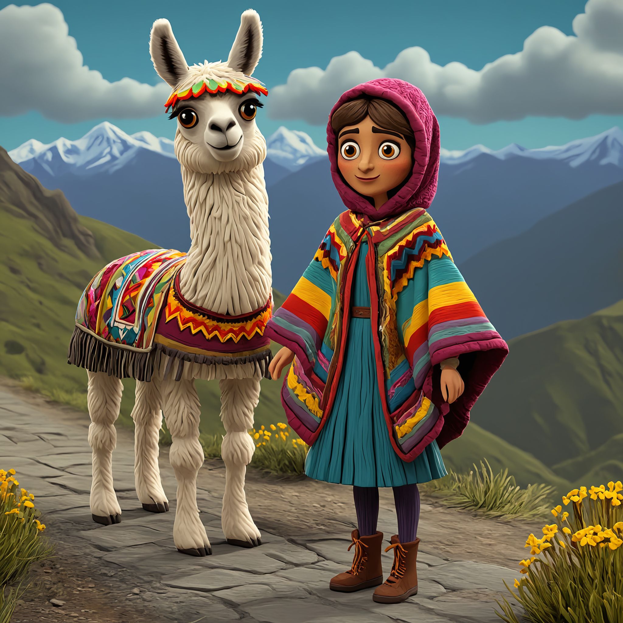 <lora:novuschroma51 style_c:1.3>, novuschroma51 style, claymation, BREAK, girl and a llama , together, girl1, wearing a montera, poncho, ojatas, lliklla, colorful blouse, embroidered jacket, llama, brown fur, colorful blanket, daytime, clouds, mountains, gray, rocky, winding path, vivid colors, high-res, beautiful aesthetic, very intricate, high-quality details, vibrant, highly detailed, pose,