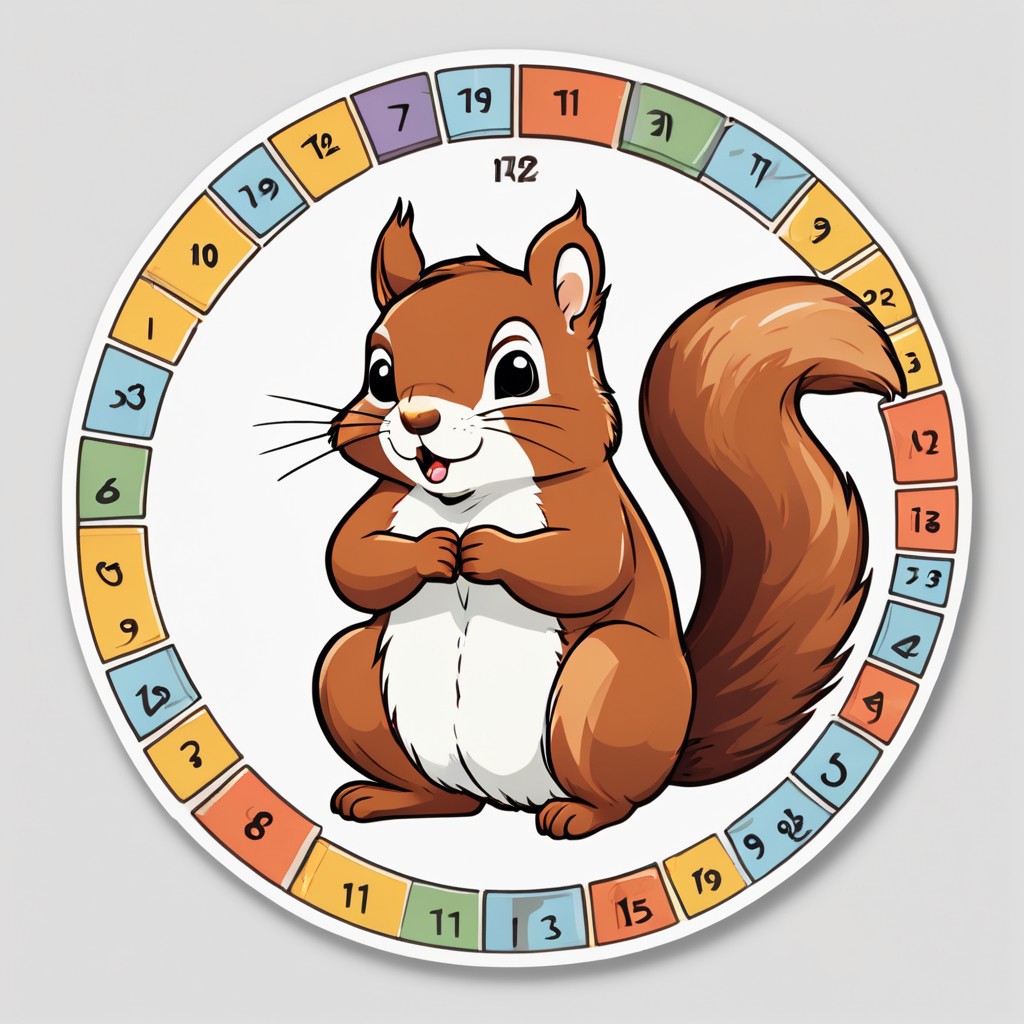 sticker depicting an annoyed squirrel being surrounded by the numbers 1 to 13 in a clock-like manner