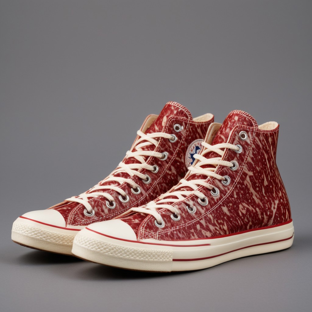 A stylish pair of Converse hi-top sneakers, meticulously crafted from rich, marbled wagyu beef, the texture glistening under soft light, detailed meat fibers forming the classic sneaker shape, beef-patterned fabric with deep umami tones, realistic shoelaces made of thinly sliced beef, high-end product photography, ultra-realistic textures, natural light, 35mm photograph, film, professional, 4k, highly detailed, Golden hour lighting. Depth of field F2. Rule of Thirds Composition.
