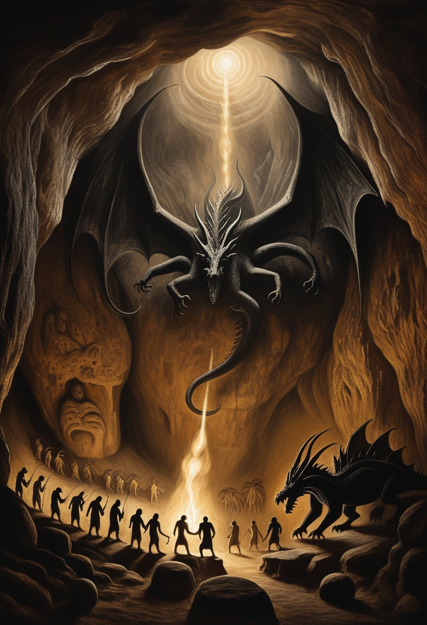 cave painting, charcoal drawing on a cave wall, primordial art. The scene captures a group of early humans in the midst of a ritual, their bodies bowed in reverence before a colossal depiction of a black dragon. The entity is represented by an gigantic black dragon. As the flickering torchlight casts shadows, it seems as if the spheres are moving, pulsating with eldritch energy, and the figures appear to sway with them. This cave painting tells a story of awe and fear, a visual hymn to the all-encompassing, all-knowing presence of Yog-Sothoth.