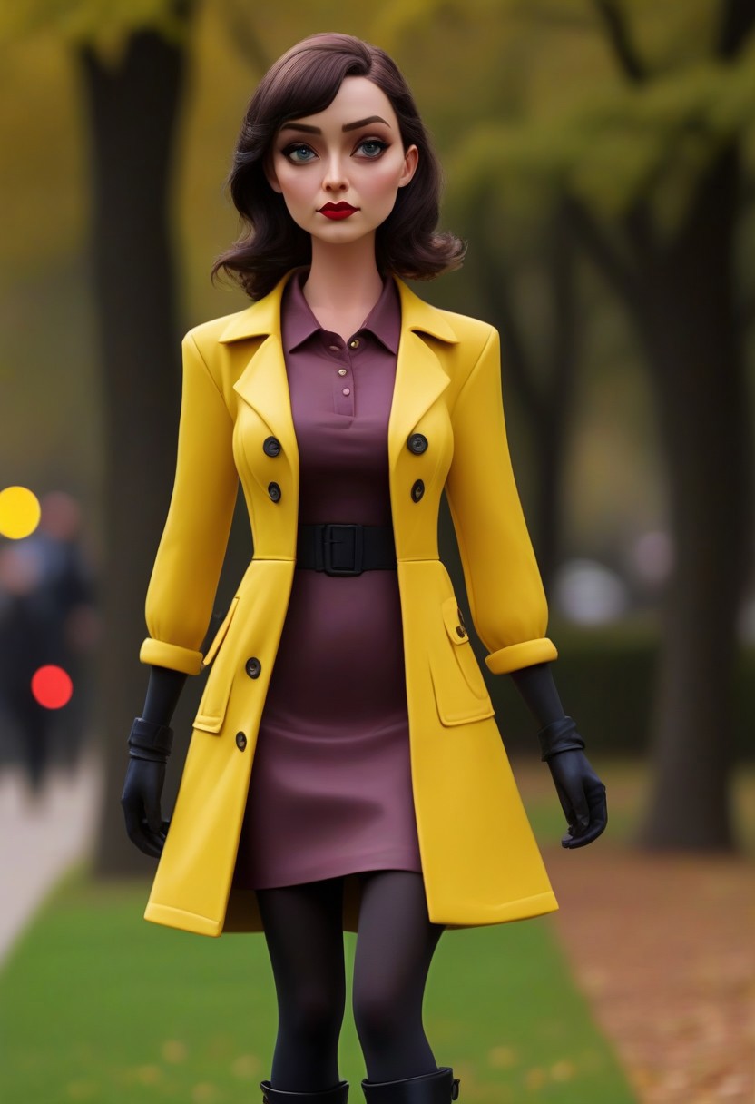 novuschroma51 style, beautiful girl, walking in a park , public park, thigh high heel boots, claymation, yellow dress