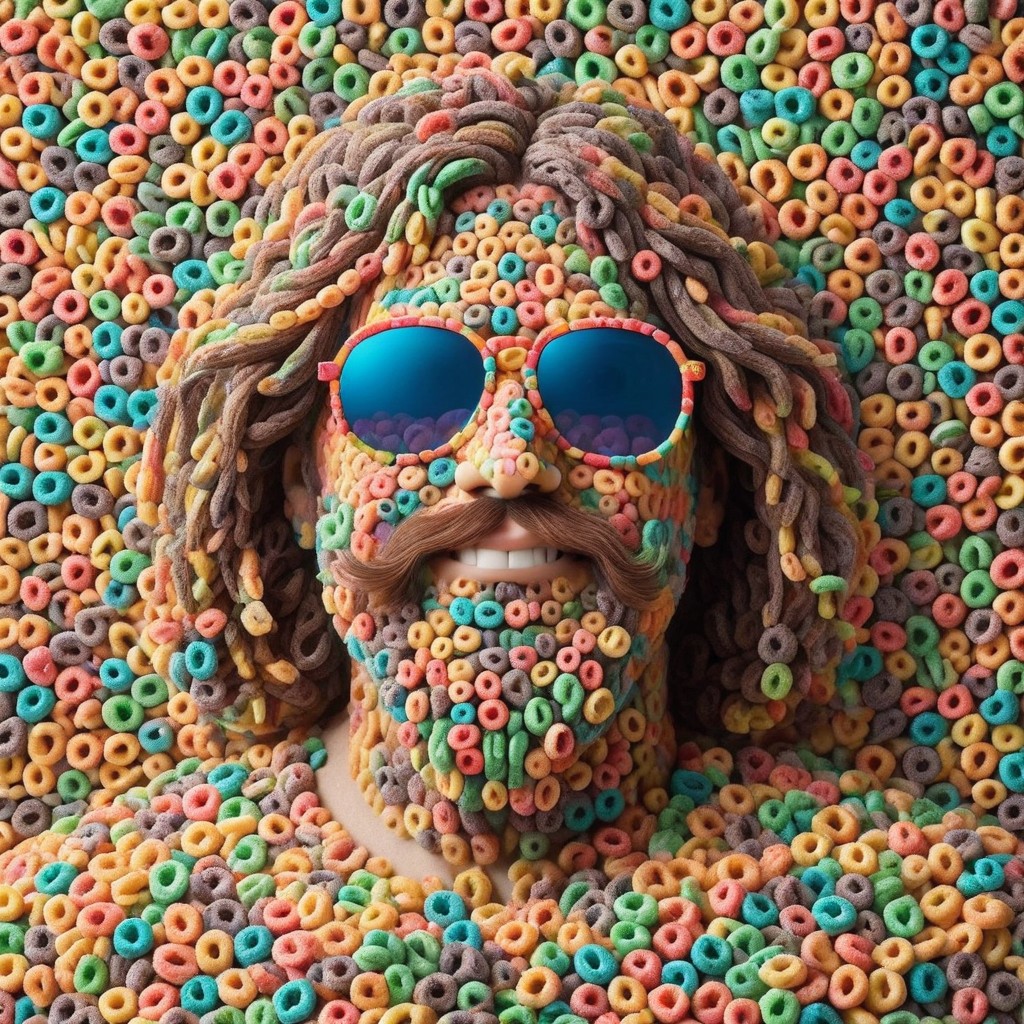 A creative portrait made entirely from Fruit Loops cereal, depicting a bearded hippy man with long, wavy hair and round sunglasses. The cereal pieces are carefully arranged to form his facial features, beard, and hair in a colorful mosaic style. He holds up a peace sign, also crafted from Fruit Loops, with vibrant colors adding a playful and artistic touch. The background is a neutral, lightly textured surface to enhance the focus on the cereal art. The image has a handcrafted, textured look, resembling a food-based mosaic or cereal art project. made of fruit loops