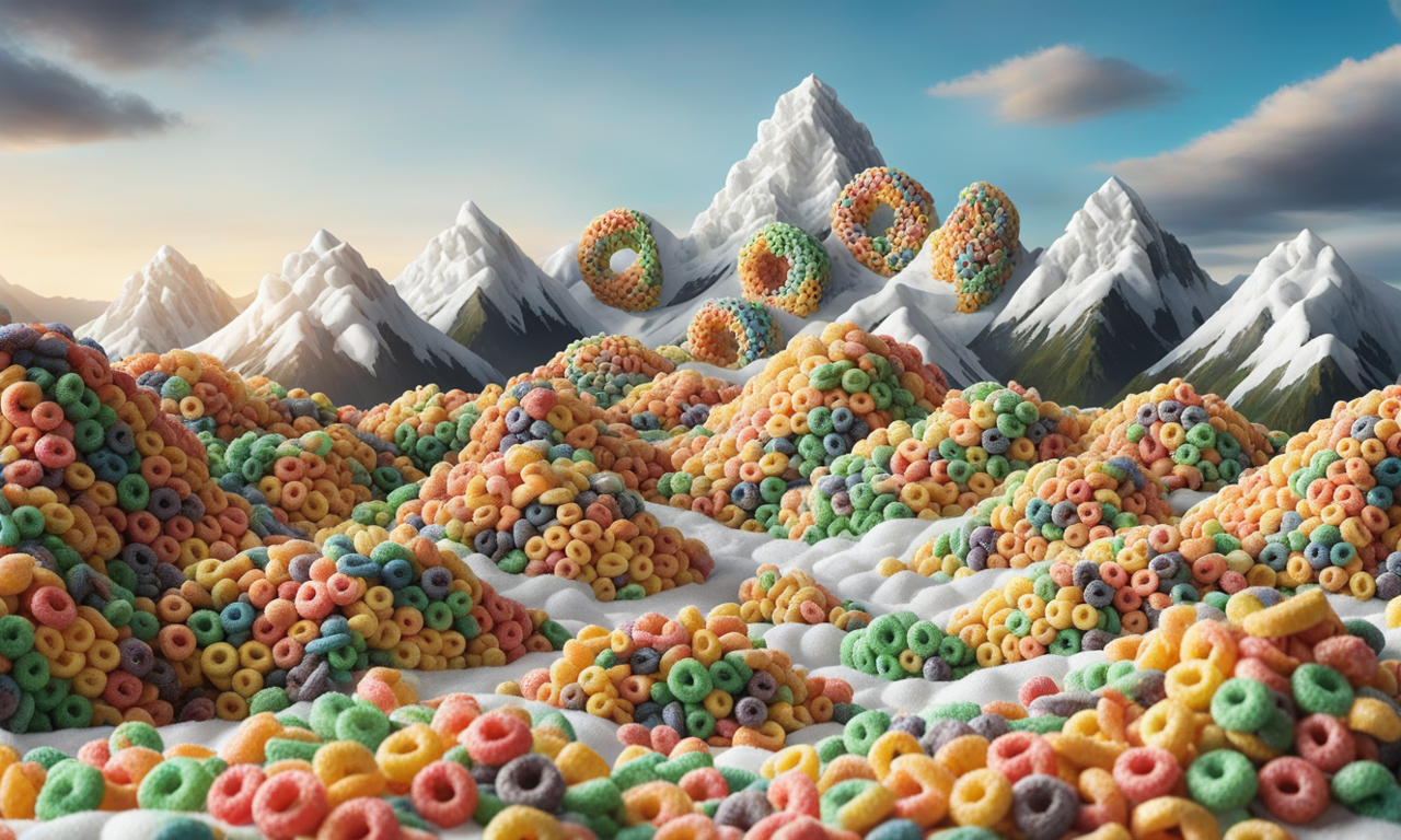 beautiful landscape, photo realistic, epic, cinematic view, beauty of nature, mountains covered in snow made of fruit loops, clouds made of fruit loops <lora:FrootLoopStyle:0.94>