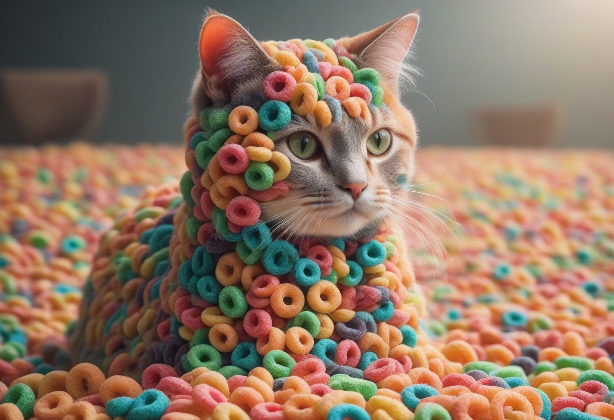 score_9, score_8_up, score_7_up, score_6_up, score_5_up, score_4_up, cat, solo, animal focus, no humans, cat, made of fruit loops, masterpiece, best quality, amazing quality, absurdres, very aesthetic, hdr, colorful, vibrant colors,