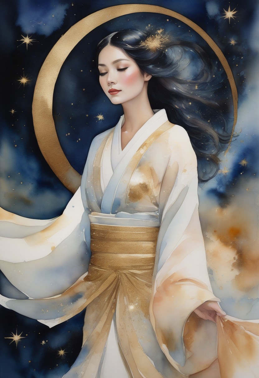 score_9, score_8_up, score_7_up ((watercolor)), ink wash, art nouveau, dynamic angle, wide-angle, full body image, surreal, abstract universe, spray of stars twinkle, dark background watercolour wash, golden-metallic accents swirl around BREAK long white hair, beautiful goddess, round flawless face, floating freely in star-spangled space, golden accents, long swirling white traditional kimono, BREAK white cloth floats around goddess, serene, weightless, benevolent smile, beauty, elegance BREAK masterpiece, best quality, amazing quality, newest, absurdres, highres, vibrant colours