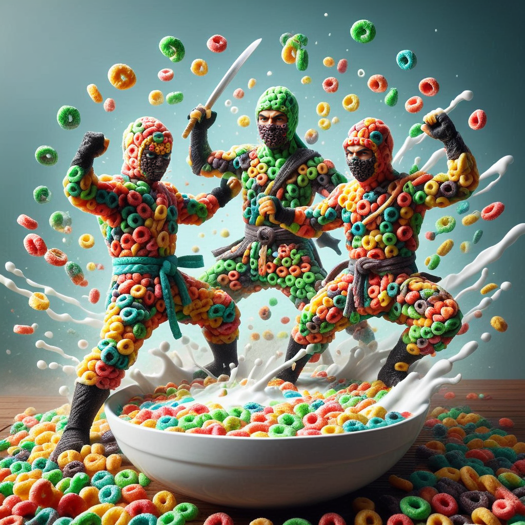 <lora:FruitLoopStyle:1>, made of fruit loops, full body shot, 2 ninjas, fighting, dynamic pose, in a a gigantic bowl, (abstract background:1.2), milk, explosion, vivid colors, high-res, very intricate, high-quality details, ultra realistic, vibrant, highly detailed, award-winning, professional,, score_9, score_8_up, score_7_up, score_6_up,