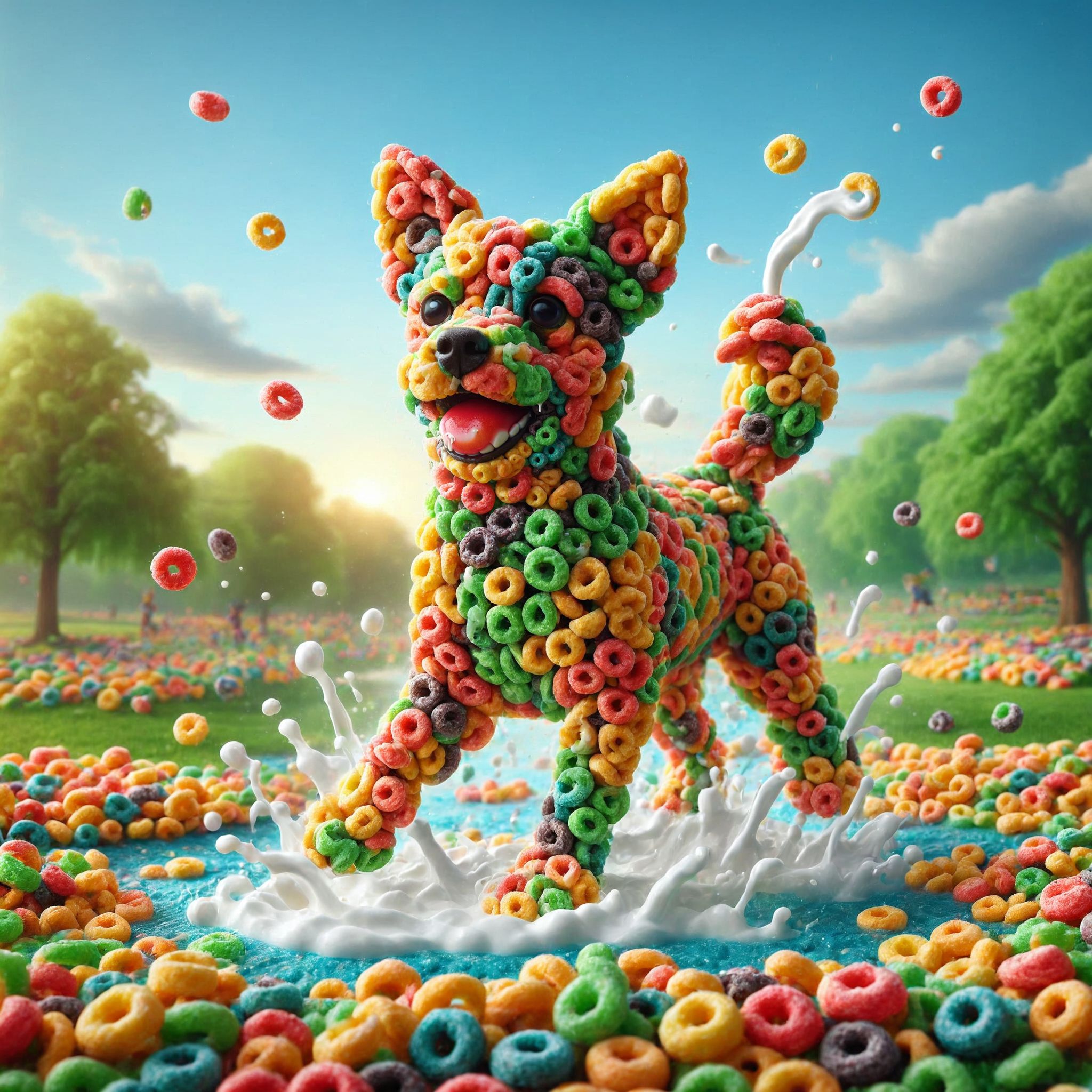 <lora:FruitLoopStyle:1>, made of fruit loops, cute dog, happy, splashing, milk puddles, running, (abstract background:1.2), raining milk, clouds, outside, golden hour, park, vivid colors, high-res, very intricate, high-quality details, ultra realistic, vibrant, highly detailed, award-winning, professional,, score_9, score_8_up, score_7_up, score_6_up,