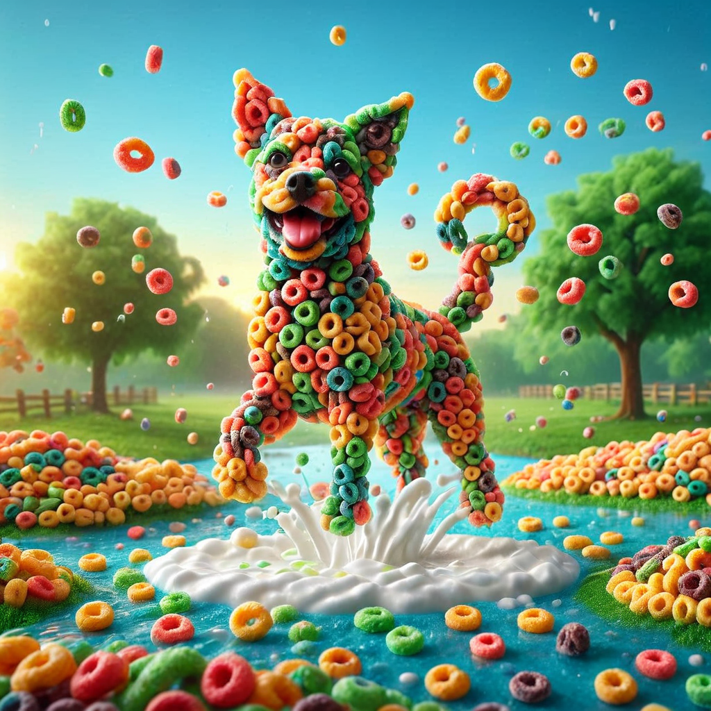 <lora:FruitLoopStyle:1>, made of fruit loops, cute dog, happy, splashing, milk puddles, high jump, (abstract background:1.2), raining milk, clouds, outside, golden hour, park, vivid colors, high-res, very intricate, high-quality details, ultra realistic, vibrant, highly detailed, award-winning, professional,, score_9, score_8_up, score_7_up, score_6_up,