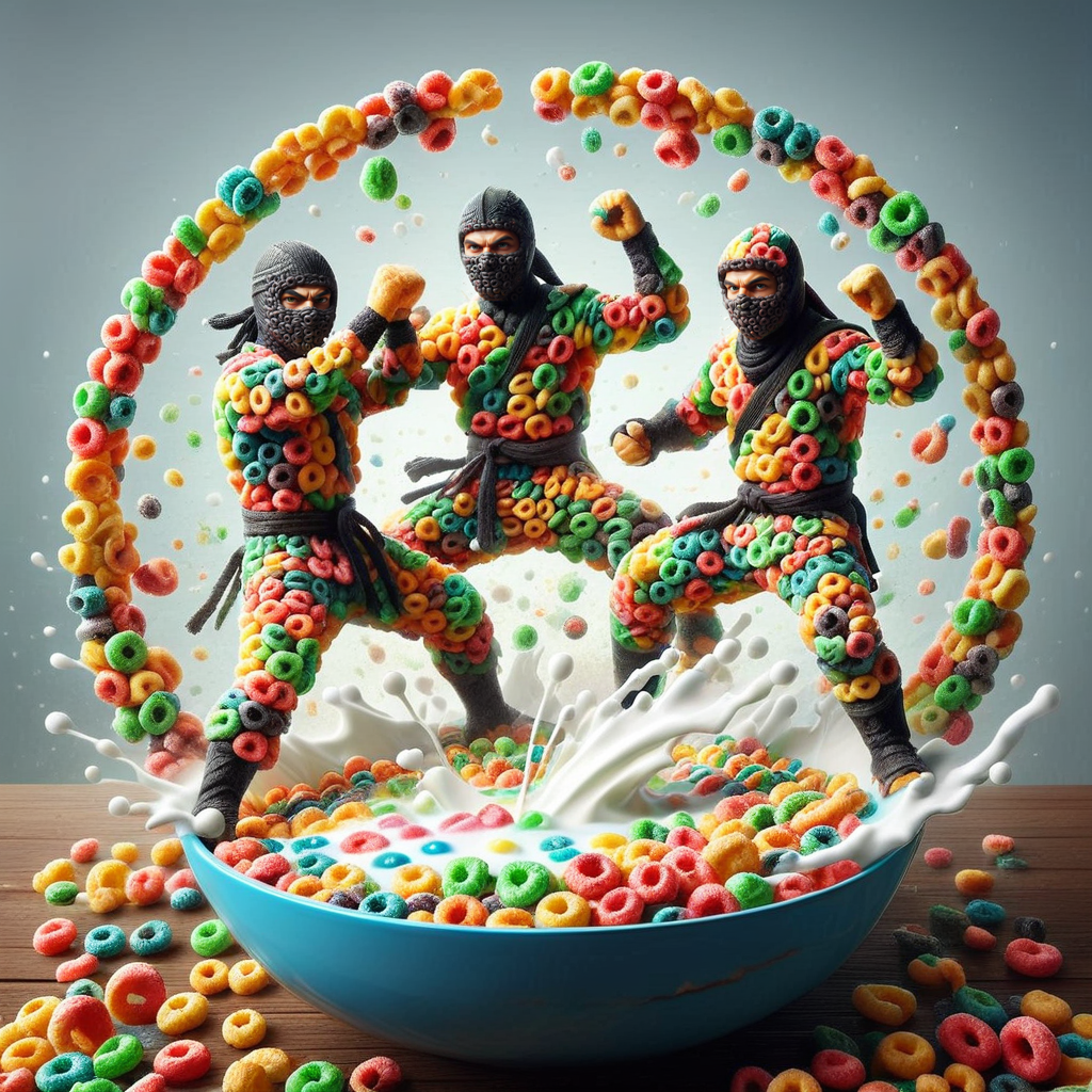 <lora:FruitLoopStyle:1>, made of fruit loops, full body shot, 2 ninjas, fighting, dynamic pose, in a a gigantic bowl, (abstract background:1.2), milk, explosion, vivid colors, high-res, very intricate, high-quality details, ultra realistic, vibrant, highly detailed, award-winning, professional,, score_9, score_8_up, score_7_up, score_6_up,
