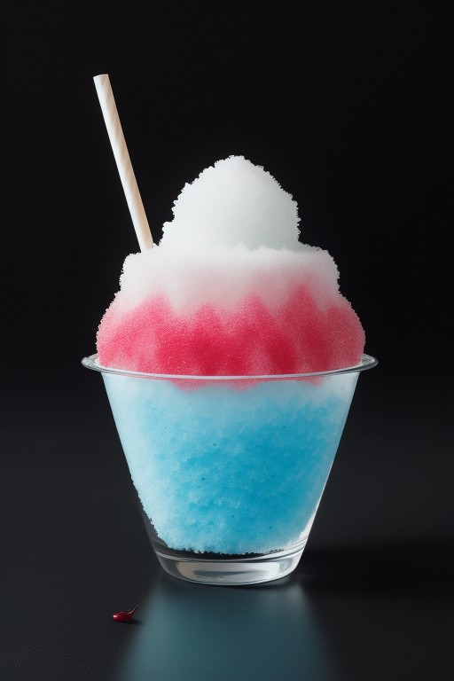 shaved ice, glass bowl, cherry on top, black background, photorealistic