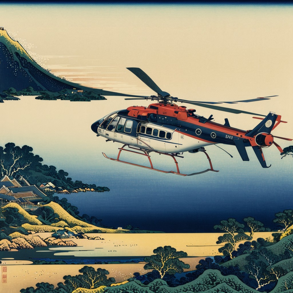 (masterpiece, top quality, best quality, official art, beautiful and aesthetic:1.2), a helicopter, 葛飾 北斎, katsushikahokusai, <lora:KatsushikaHokusai:1.0>