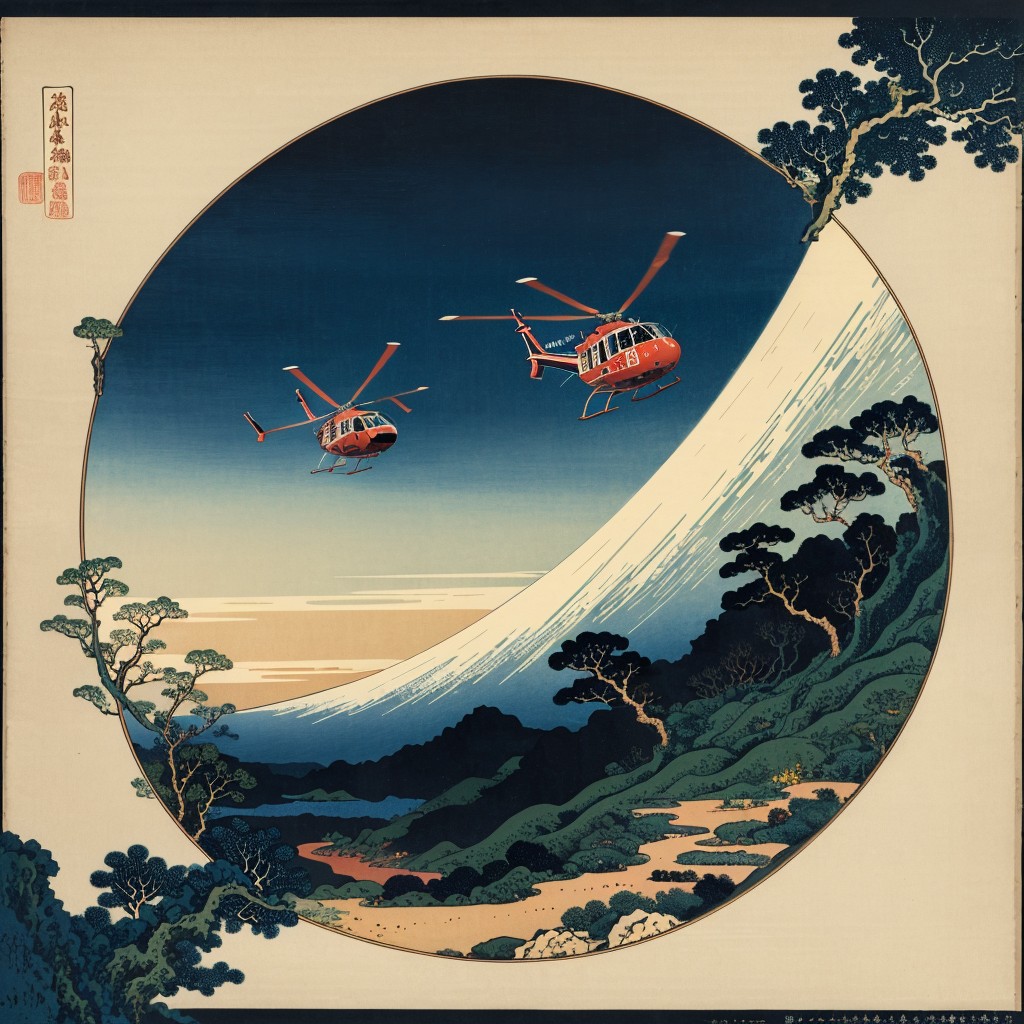 (masterpiece, top quality, best quality, official art, beautiful and aesthetic:1.2), a helicopter, 葛飾 北斎, katsushikahokusai, <lora:KatsushikaHokusai:0.5>