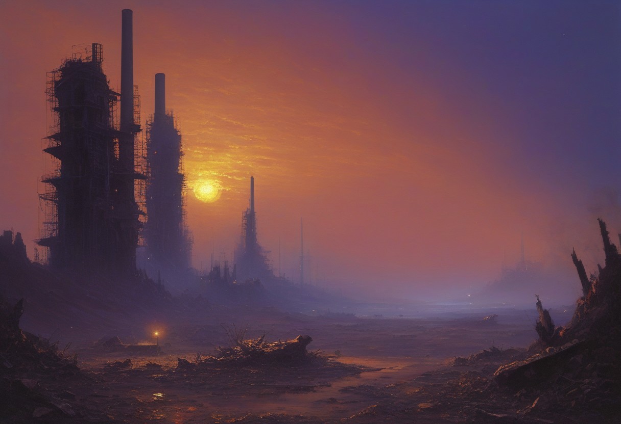 masterpiece, high resolution, alienworld, blue and purple theme, dark clouds cover the skies, <lora:Alien_World-xl-8:0.6>, monumental architecture,<lora:more_details:0.35>, dark athmosphere, grim world, dusty sky, industrialbuilding, a bright source of light in the distance among the ruins of giant factories, the horizon is hidden behind many tall industrial buildings, bright light in the center in the distance inside the entrance to a giant industrial tower, rich light and shadow, realistic,<lora:EMS-61413-EMS:0.500000>,<lora:EMS-274228-EMS:0.500000>,<lora:EMS-283796-EMS:1.000000>