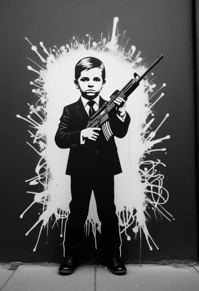 a black and white stencil of a toddler wearing a suit and tie, holding an assault rifle, stencil, graffiti style black and white, ,high contrast, Shepard Fairy style