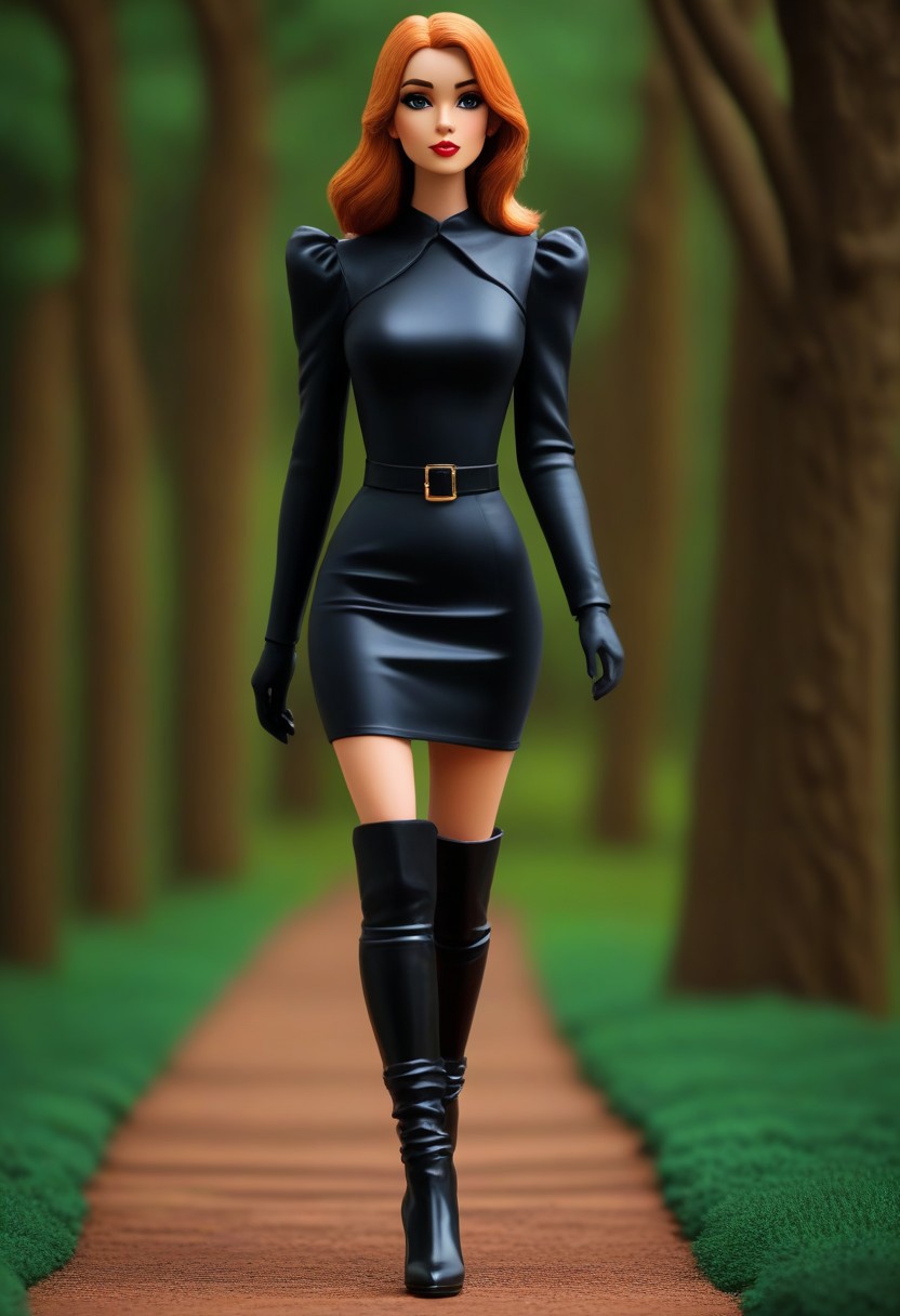 beautiful girl, walking in a park , public park, thigh high heel boots, claymation, black latex catsuit skirt novuschroma51 style