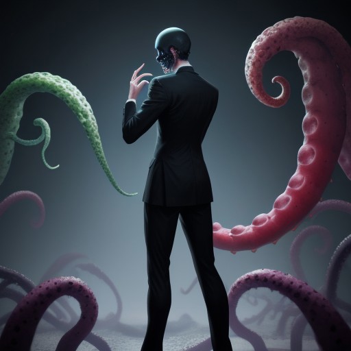 slender man,faceless,long arms,sharp fingernails,long legs,black suit,black_ascot,monster,no humans,black tentacles extend from behind,body horror,horror \(theme\, fruit loops on tantacles