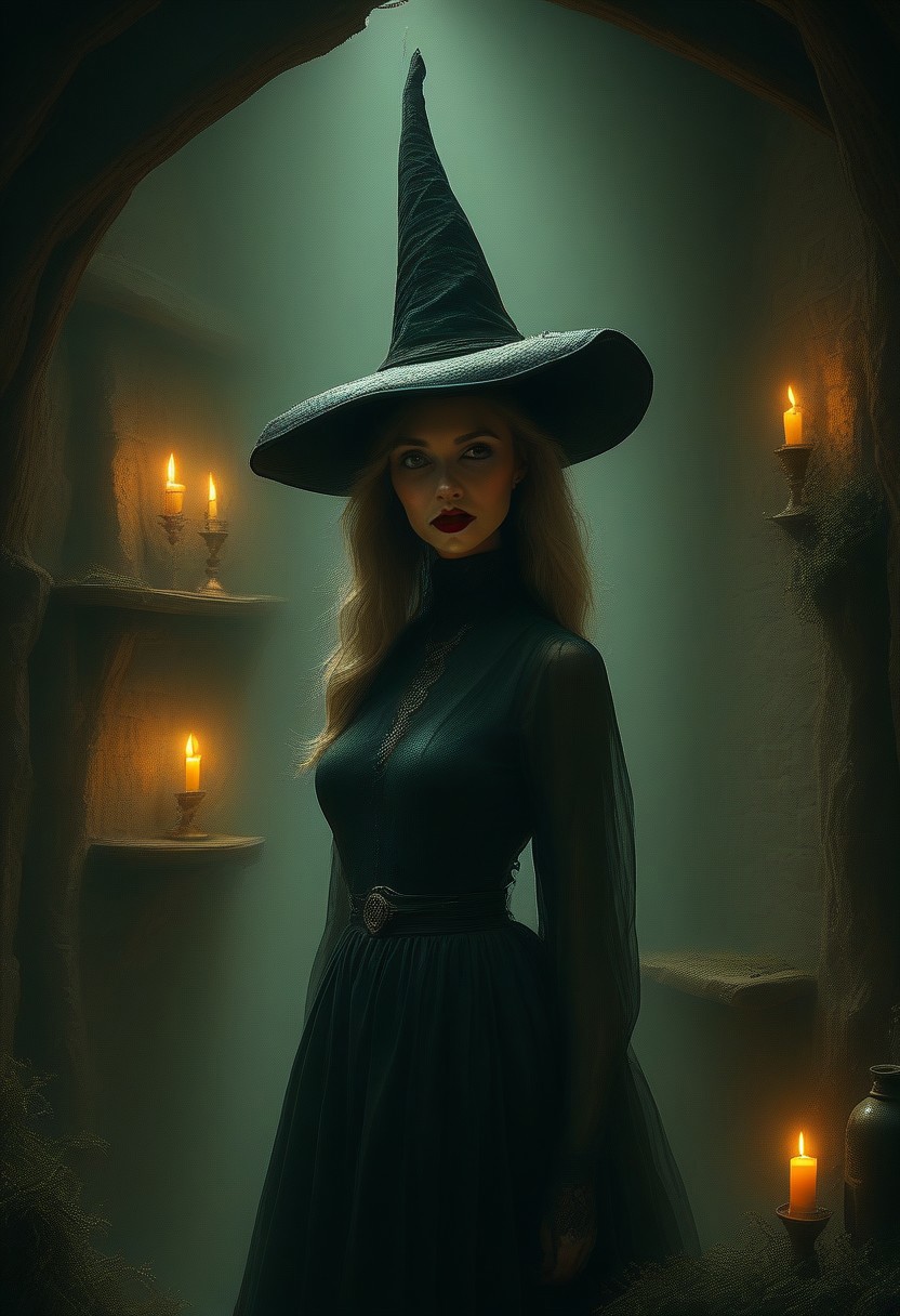 beautiful mysterious woman, close-up, portrait, wide-brimmed black witch hat, kind bright green eyes witches cottage background, striking red lips, intrigue, subtle lighting, contours and shadows, enigma, allure, Delicate, patterns, motifs, mystery, elegance, captivating beauty., curvy slim woman with perfect breasts, wearing a black mesh bodysuit w1tch h0us3, 1girl wiccan_witch, wicca, magic, magical, fantasy, glowing, magical supplies, magical symbols