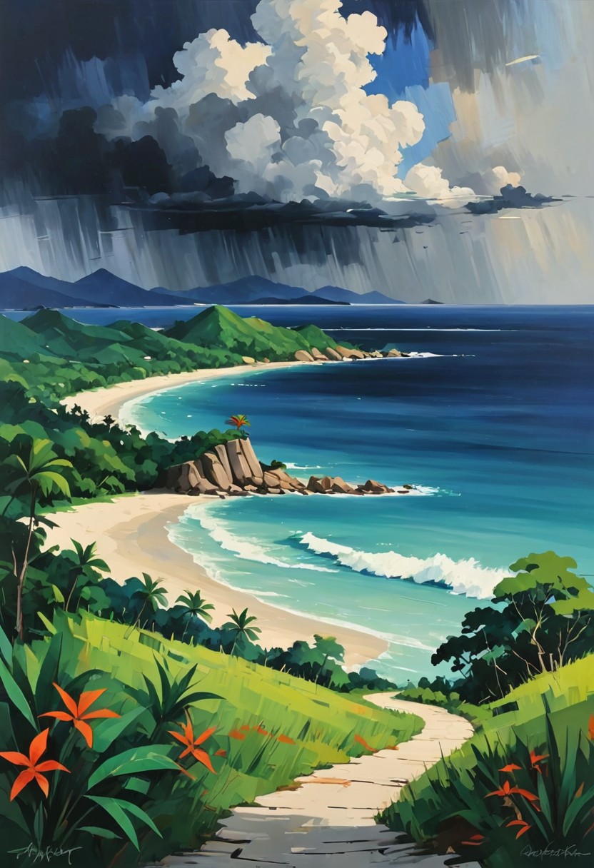 anime, Suprematism, landscape of a Ko Samui, Stormy weather, (stylized by Ayako Rokkaku:1.1) , Tranquil, rich colors