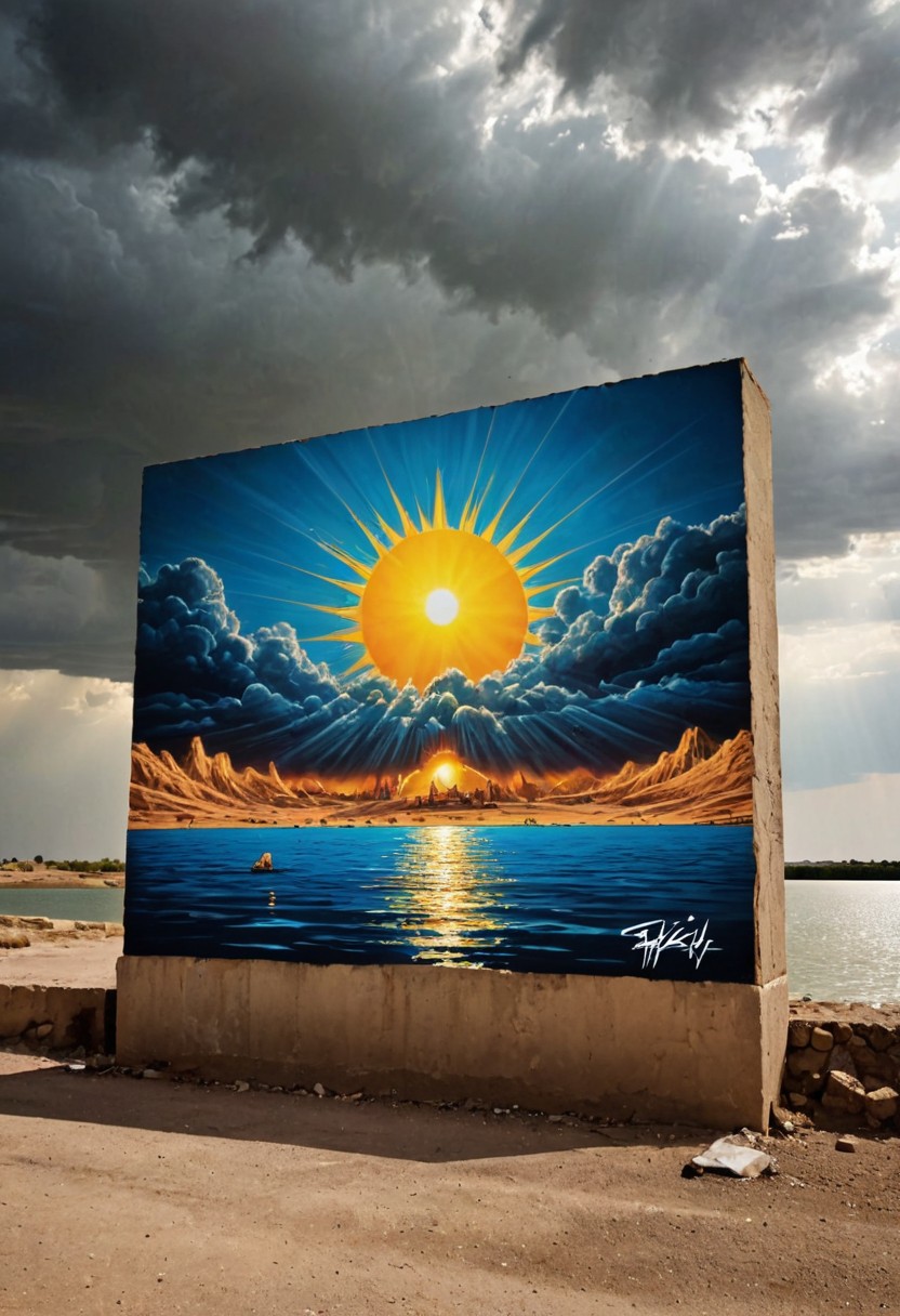 superb wall Graffiti, glamourous, low angle shot of a Tiny Traditional ("The End of Paradise":1.3) , Iraqi lake and Solar prominence in background, Stormy weather, Panorama, Screen print, Fae, Bastardcore, radiant god rays, Low shutter, Mono Color, Ribbons, MOBA style, 8K, Flickr, indigenous, innocent, flawless