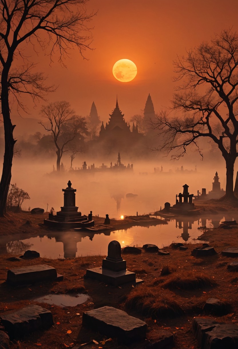 (designed by Vittorio Tessari:1.1) , grand Drawing, fall lake and Aries constellation in background, award winning, landscape of a Vintage Pleated electric orange (Aglarond:1.3) and Haunted Thai Chinese Eerie fog-covered cemetery, Cosmic rays background, at Sunset, Realistic, Guilty, Queercore Art, soft fill lighting, F/14, dark red hue, emphasis lines, Crepuscular Rays, wallpaper, professional