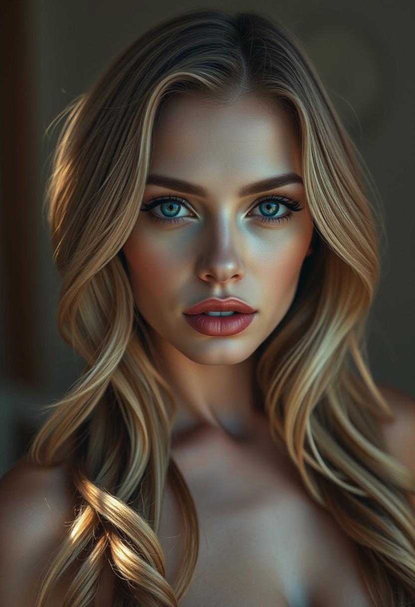 A stunning beautiful woman with ((piercing emerald eyes)), porcelain skin, and very large very plump Full lips, her luscious Goldy Pastel hair cascading down around her torso in loose effortless waves. Soft golden natural light wraps around her, casting a warm glow on her skin, while a shallow depth of field and creamy bokeh blur the background, drawing the viewer's gaze to her serene alluring presence. Captured with a telephoto lens on a 64-megapixel DSLR Canon, the image exudes a sense of intimacy and quiet confidence, with sharp focus on the subject's face and subtle, nuanced expressions, evoking the works of professional photographers like Annie Leibovitz, Mario Testino, and Paolo Roversi. (Photorealism, Ultra-Realism), (epic), (masterpiece), trending on Artstation, golden ratio, 32k UHD, HDR,