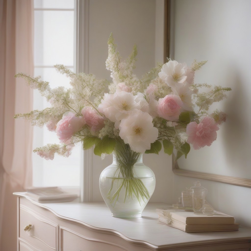 A graceful vase holding spring flowers sits atop a dresser, with delicate pink and white blooms accentuating the soft elegance of the scene. The background is light and airy, with soft brushstrokes creating a dreamy atmosphere. The image has a fluid, painterly feel, with detailed yet subtle petals and branches that exude a sense of freshness and serenity. The soft lighting highlights the gentle reflections in the vase, while the blurred glass window in the foreground adds depth and enhances the peaceful mood. The overall composition is soft, elegant, and full of delicate beauty.