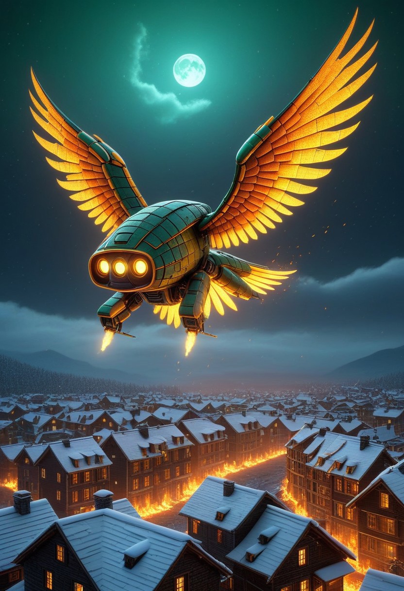 A flying robot Flying in the sky, flying:1.4 made of glowing shingles, ,fiery colors, deep green, electric yellow, molten gold edges, , wings spread wide, leaving a trail of glowing embers, snow, city, night time, moon ,stormy sky, dramatic backlight, high contrast, ,cinematic lighting, ultra-detailed, photorealistic, trending on ArtStation, 8K, masterpiece, octane render, volumetric fire.