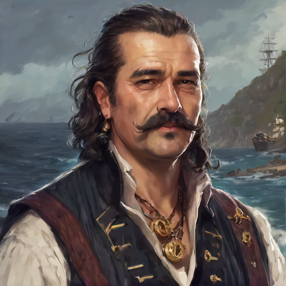 dutch, Pirate captain, fat and strong, (smiling:0.4), gold jewelry, dark brown eyes, greying hair, long black mustache, (colorful:0.5) clothing, black vest, coast background, digital art