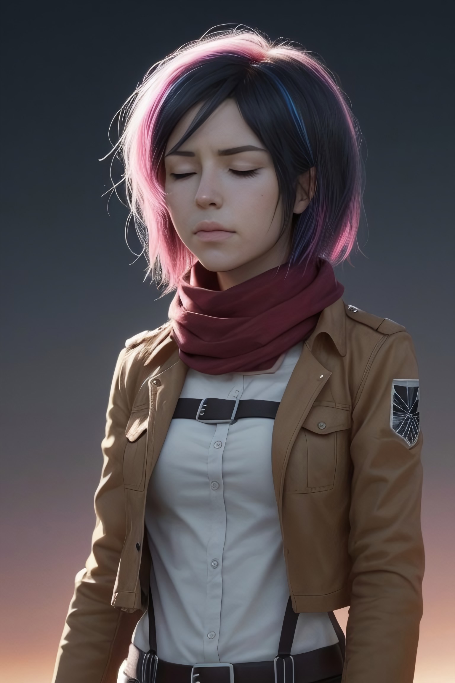 The image features a close-up of a mikasa_ackerman eyes closed, and vibrant, neon-colored streaks flowing from their eyes down face and hand. Purple, pink, green, and blue colors. Frontal angle, focusing closely on girl face and upper body. The lighting is soft and even, highlighting the details of the subject's skin and the vivid colors of the streaks. The light source seems to be positioned in front of the subject, ensuring that the colors are bright and well-defined. Shadows are minimal, maintaining the clarity of the image. The background is completely black, which isolates the subject and makes the colors pop even more. This stark contrast draws all attention to the subject and the artistic elements of the image. There are no other objects or distractions in the background, keeping the focus solely on the person and the neon streaks. The composition is centered, with the subject's face taking up most of the frame. The hand gently touching the mouth adds an element of intrigue and emotion to the image. The lines of the neon streaks lead the viewer's eye across the face and down the hand, creating a dynamic flow within the composition. The overall effect is both artistic and emotive, evoking a sense of mystery and creativity. anime, , bboil artist style, OBdonman, Anime art, hmmikasa, short hair, black eyes, scarf, emblem, belt, thigh strap, red scarf, white pants, brown jacket, long sleeves