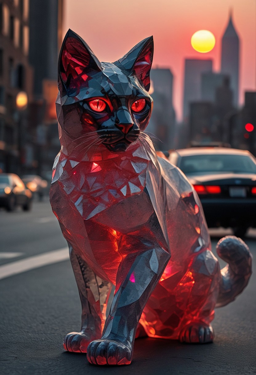 rp_slgd, 1 crystalized giant cat on the road, manhattan henge, sunset, bokeh, depth of field