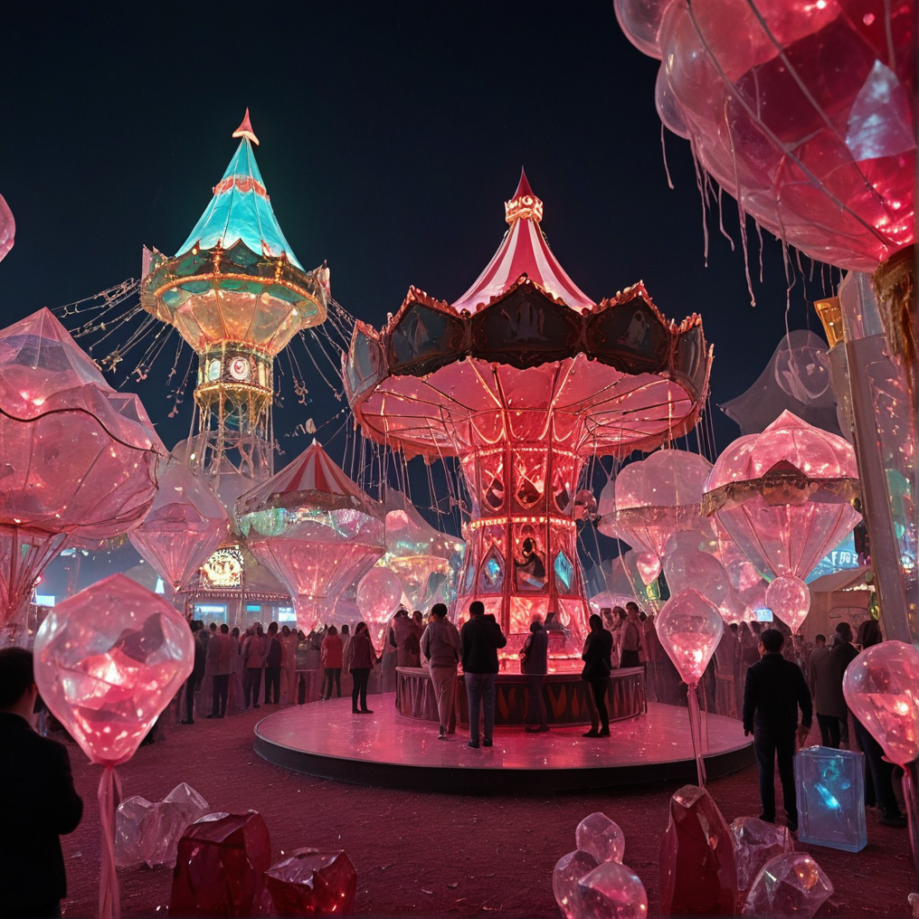a carnival fairground illuminated by neon-colored crystals, rides constructed from sharp-edged glass, gemstone prizes sparkling in game booths, translucent balloons drifting through the festive air, whimsical charm abound <lora:xl_rpr_soulgemmed_v1:1.0>