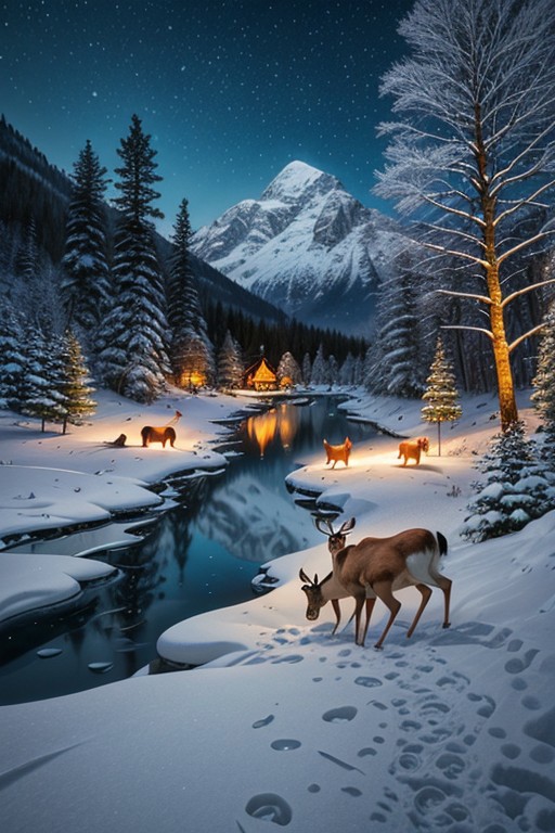 a mystical winter wonderland nestled in a secluded valley. Snow-covered mountains surround the scene, and a gentle snowfall adds a soft, peaceful touch. A crystal-clear lake reflects the moonlight, with ice skaters gliding gracefully across its surface. Nearby, a cozy cabin with smoke curling from its chimney sits amidst a grove of evergreen trees decorated with twinkling fairy lights. A family of deer wanders through the snow, leaving delicate footprints behind. The entire landscape is bathed in a serene, magical glow, creating a sense of tranquility and enchantment. <lora:add-detail-xl:1> <lora:Dynamic Poses:1>