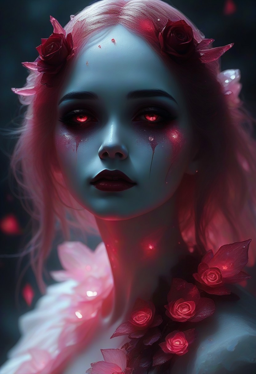 1girl, semi_realistic, detailed face, emo makeup, short hairs, veil made from milk, wedding dress made of jade, fairy wings made from crystal, biolumen,hair accesory, holding a single rose made from ruby, the contur of the rose petals glow eerily white, dim light, intricate details, horror theme, cementary, detailed background, red_theme, matte_color, flat color,
