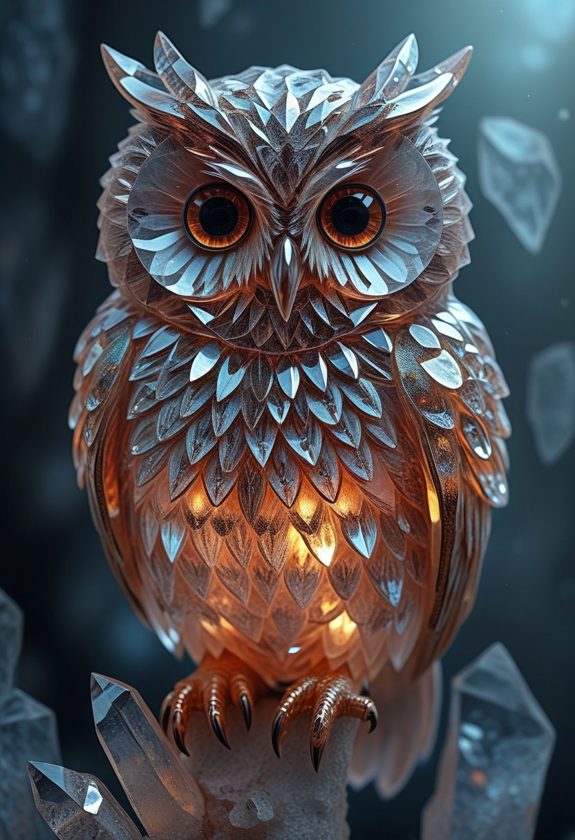 Masterpiece, High Details, HD, 8K, Photorealistic, perfect, High Quality, rp_slgd, , crystalized owl, beauty, ethereal background