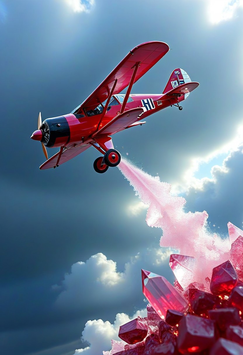 (masterpiece), (high detail), rp_slgd, iridiscent,flu0rite, flux-style, biplane made from ruby crystal, sharp edges, flying, view from below, stormy weather