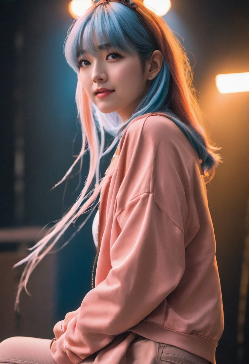 photo shot full body view of a 20 year old women with blue hair and aqua eyes, sitting and balancing a Gibson Les Paul electric guitar on her head, long hair flowing, focused expression, natural stage lighting, rock concert atmosphere , . She is wearing a orange shirt top and an open pink track jacket that reveals her bare shoulders and stomach. Her long hair, adorned with a cube hair ornament, falls over her eyes, and she is smiling with an open mouth and raised eyebrows. she has large breasts, ,she wear short red jean reveal some of her thighs are also visible. her long hair flowing, focused expression, natural stage lighting, rock concert atmosphere, high-quality rendering, no artifacts, smooth skin, no distortions, blurred background, soft shadows <lora:gotou_hitori_xl:1>
