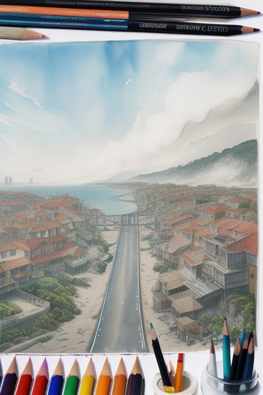 watercolor, pencils, ink, clear contours, airy, transparent, haze, abstract, pastel colors, tansu ozmen, seaside town, road to the sea, beautiful, quantum rendering, realism, hyper-detailed, colorful, natural lighting, close-up