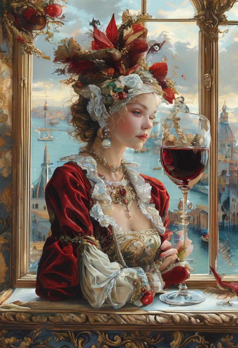 A still life in the style of 17th-century Dutch masters: Venetian mask with gilt edges and velvet texture, antique brass hourglass, crystal goblet filled with red wine, grapes with dewdrops. Dramatic Rembrandt-style lighting from a side window casting deep shadows. Through the window: a fantasy landscape — medieval castle with floating bridges and stained-glass towers, Baroque clouds (voluminous, illuminated by golden light), and a majestic dragon with iridescent scales soaring across the sky. Details: dust motes in light beams, cracked plaster walls, dragon's reflection in the goblet. Technique: oil painting with glazing layers, chiaroscuro contrast, hyperrealistic textures of aged wood and polished crystal.