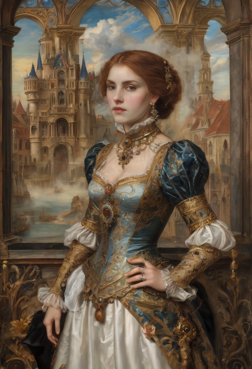 John William Waterhouse style, Peter Paul Rubens Style, A lavish full body portrait of a woman in a hybrid Baroque-steampunk gown: velvet dress with copper gear embellishments, a corset featuring piston patterns, steam pipes integrated into the fabric. She holds a Venetian mask adorned with gilt and intricate filigree. Rubenesque figure: luminous pearlescent skin, soft curves, rosy cheeks. Background: a fantasy landscape with a floating medieval castle (spires with stained glass, aerial bridges), Baroque-style clouds rendered with voluminous chiaroscuro effects. Details: alchemical vials as earrings, a mechanical wing-shaped brooch, smokey fabric merging with steam from waist-mounted devices. Rubens' influence: oil painting texture, contrast between warm flesh tones and steampunk metallics, dramatic lighting blending golden hour rays with industrial smoke,