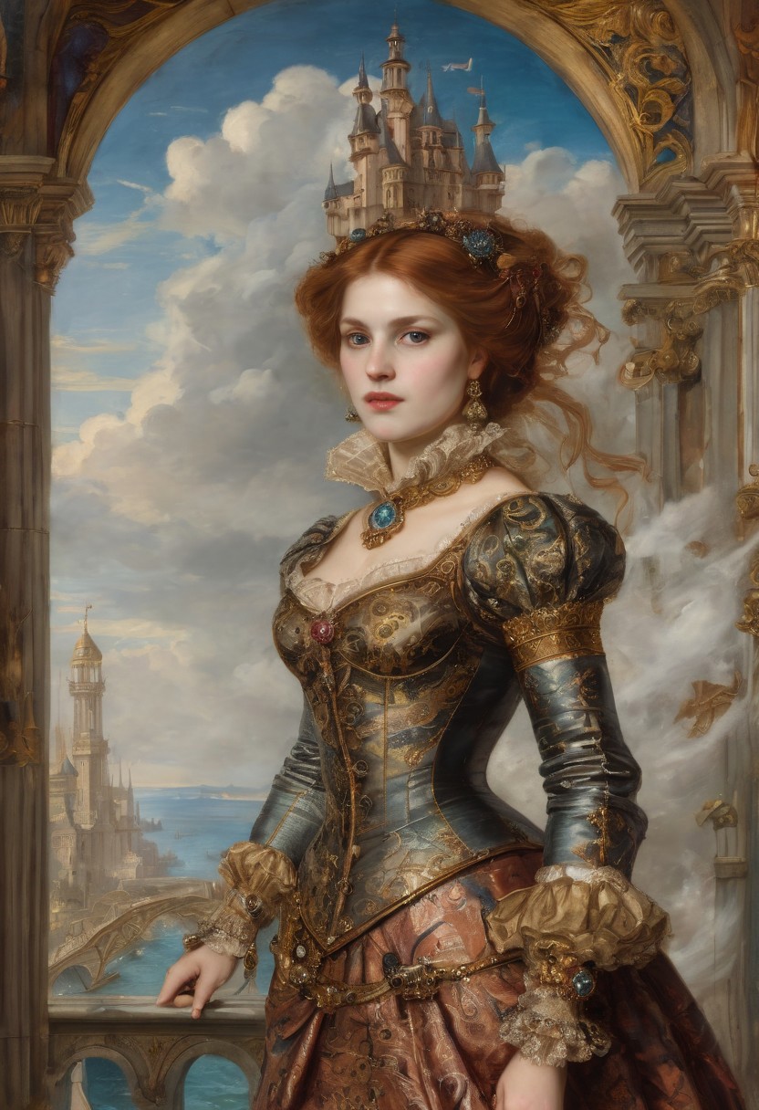 John William Waterhouse style, Peter Paul Rubens Style, A lavish full body portrait of a woman in a hybrid Baroque-steampunk gown: velvet dress with copper gear embellishments, a corset featuring piston patterns, steam pipes integrated into the fabric. She holds a Venetian mask adorned with gilt and intricate filigree. Rubenesque figure: luminous pearlescent skin, soft curves, rosy cheeks. Background: a fantasy landscape with a floating medieval castle (spires with stained glass, aerial bridges), Baroque-style clouds rendered with voluminous chiaroscuro effects. Details: alchemical vials as earrings, a mechanical wing-shaped brooch, smokey fabric merging with steam from waist-mounted devices. Rubens' influence: oil painting texture, contrast between warm flesh tones and steampunk metallics, dramatic lighting blending golden hour rays with industrial smoke,
