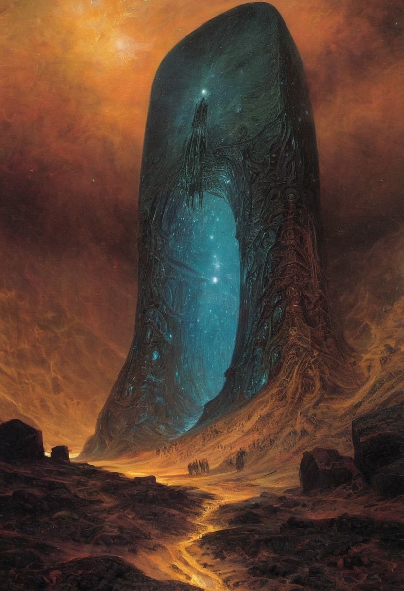 The lovecraftian depiction of the unimaginable inevitable endless cosmic horror coming from the deadly void of space in the form of the giant irritating ethereal indescribable ancient non-euclidean monolith as a shadow of the unknown vanished civilization hidden in the cold antarctic dreadful valleys, high quality, detailed, intricate details, masterpiece, bleak, classic art, oil painting, by thomas moran, by zdzislaw beksinski