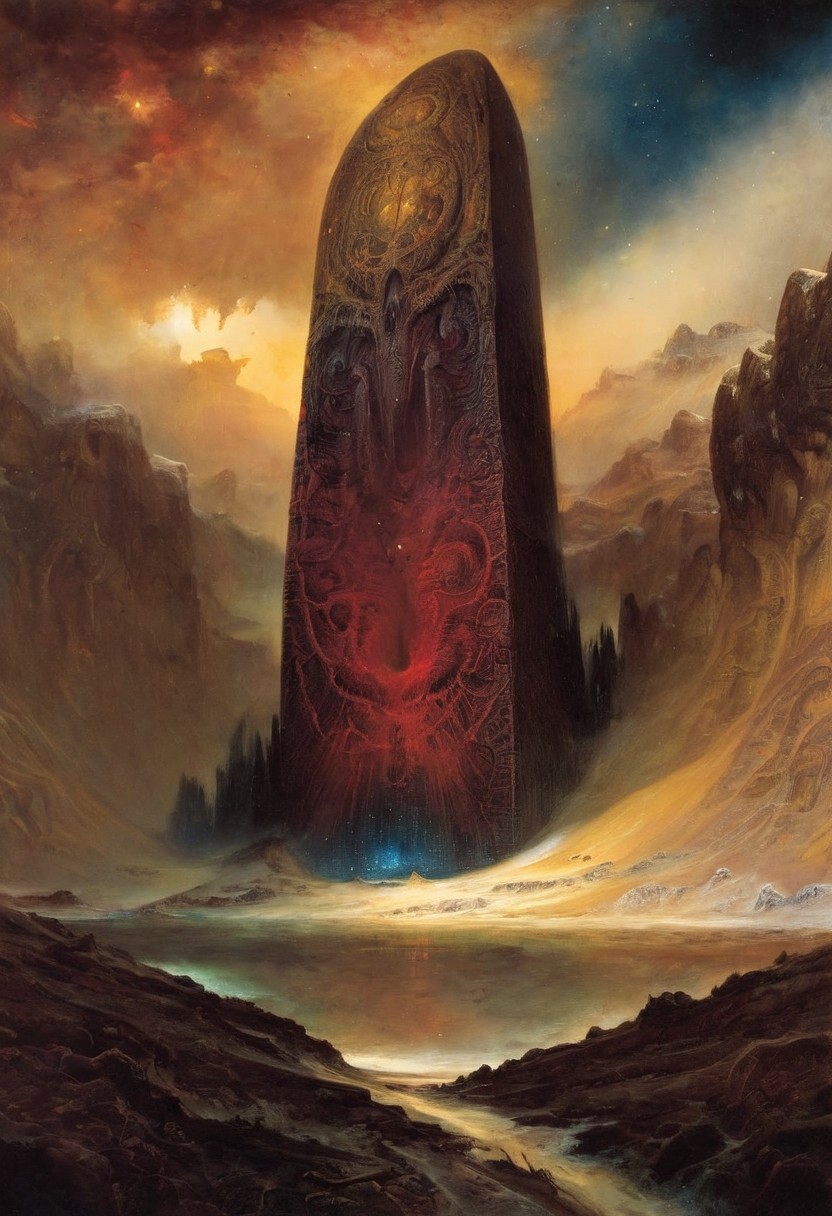 The lovecraftian depiction of the unimaginable inevitable endless cosmic horror coming from the deadly void of space in the form of the giant irritating ethereal indescribable ancient non-euclidean monolith as a shadow of the unknown vanished civilization hidden in the cold antarctic dreadful valleys, high quality, detailed, intricate details, masterpiece, bleak, classic art, oil painting, by thomas moran, by zdzislaw beksinski